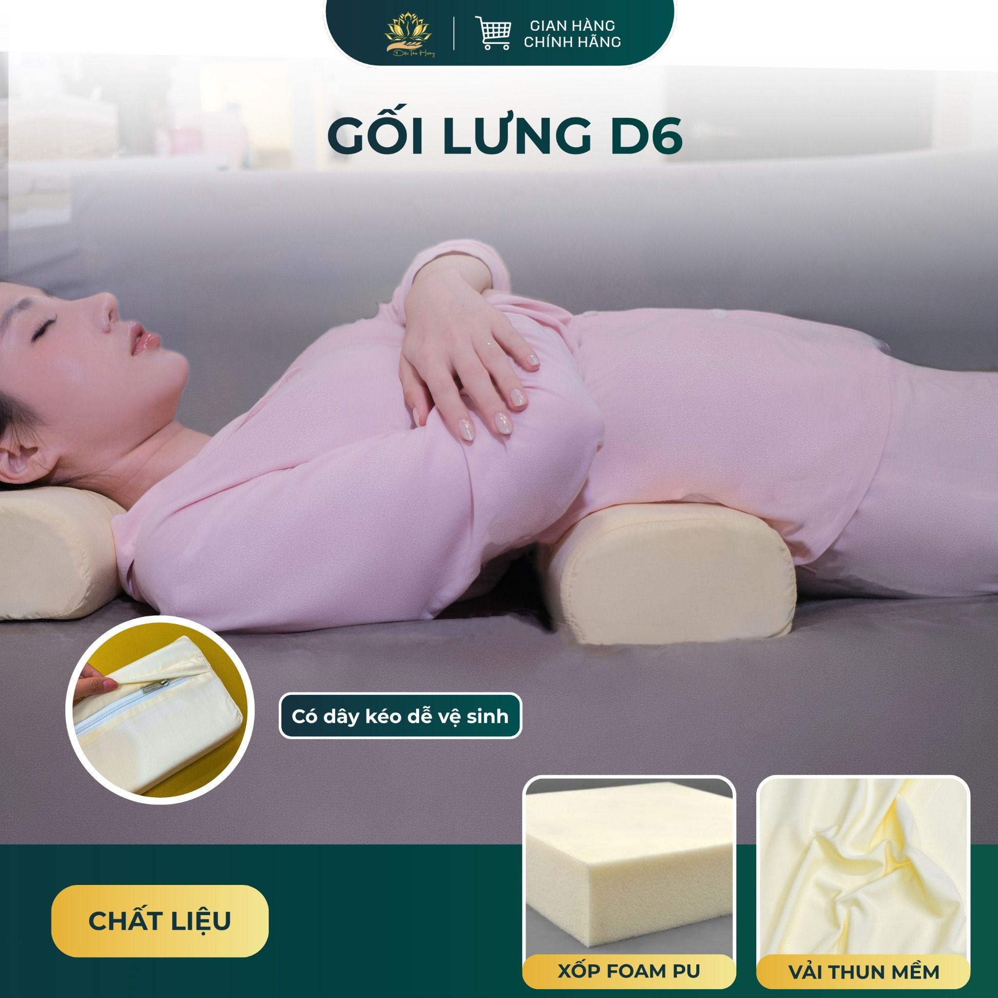 THÔNG SỐ KỸ THUẬT Tên sản phẩm: Gối lưng D6 Thương hiệu: Diệu Tâm Hương - Gối cho cột sống khỏe Xuất xứ: Việt Nam Kích thước: D x R x C (cm): 38 x 16 x 10